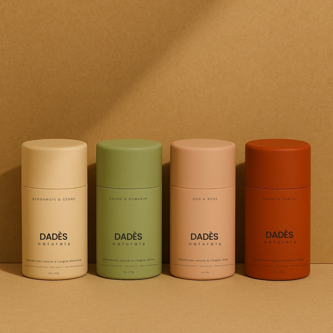 Déodorants naturels à base d'argile et minéraux. Sans sels d'aluminium. Sans bicarbonate. Sans alcool.